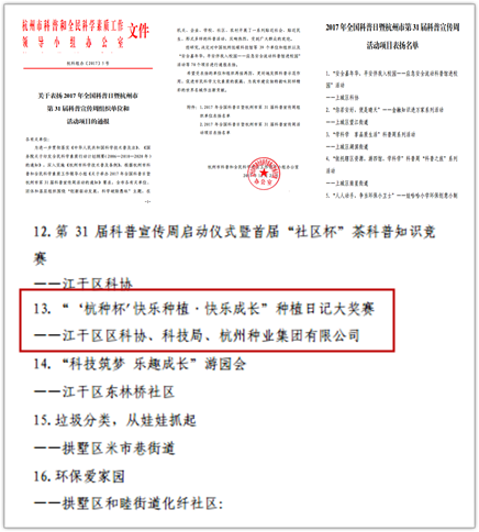 近日,集团公司收到杭州市科普和全民科学素质工作领导小组来文《关于表扬 2017 年全国科普日暨杭州市第 31 届科普宣传周组织单位和活动项目的通报》(杭科组办〔2017〕5 号),经严格审核研究,对种业集团携江干区科协、科技局联合举办的“‘杭种杯'快乐种植·快乐成长”种植日记大奖赛”活动(以下简称种植活动)进行通报表扬。