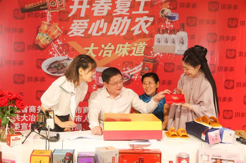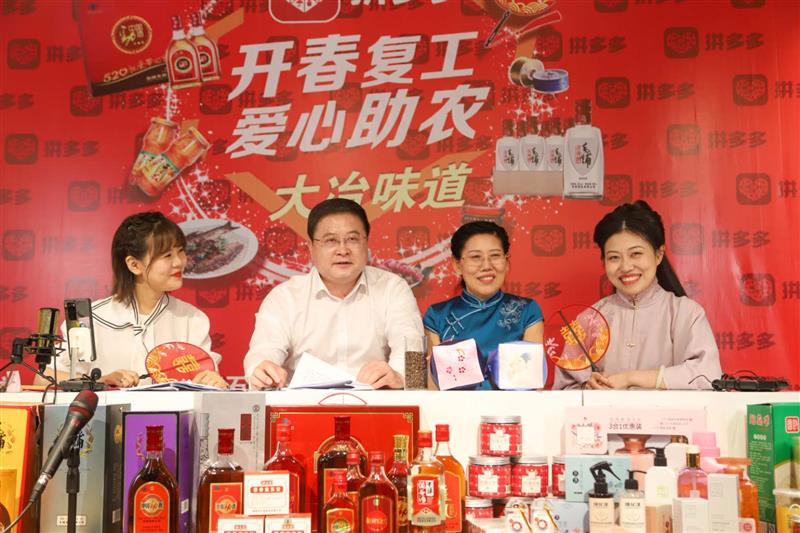 湖北黄石大冶市委书记王刚正在电商直播间代言当地特色农产品。