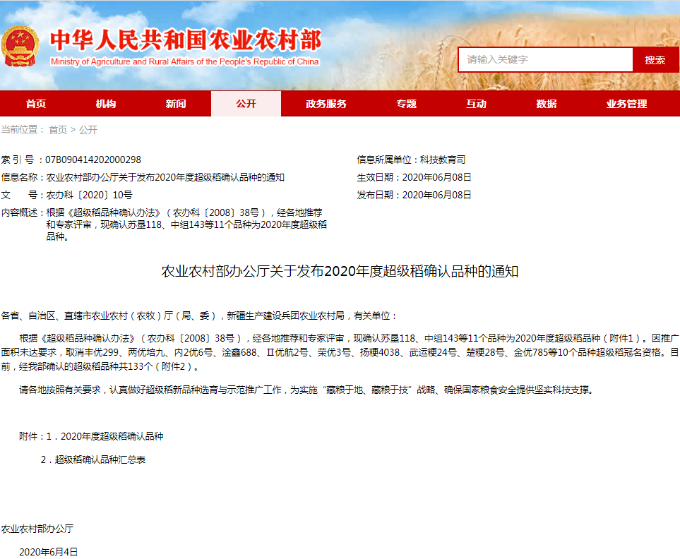 6月8日,农业农村部办公厅发布2020年超级稻品种认定结果, 杭州种业集团独占全国生产经营的‘中组143’成为早稻超级稻品种新成员。