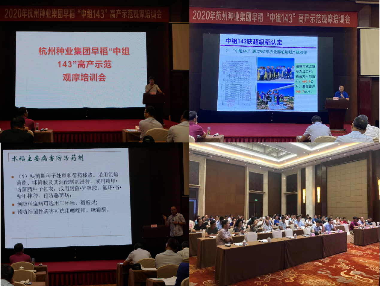 现场观摩交流。连续组织全省有关市(县、区)种子推广部门、种子经销商、家庭农场和规模种粮大户等代表,实地观摩早稻高产示范现场,学习交流高产栽培技术,诸暨市姚江镇502亩早稻超级稻品种‘中组143’高产示范现场,攻关田理论亩产达到704.3公斤,与会代表现场发出了“中组143,妥妥一千三”的朋友圈。