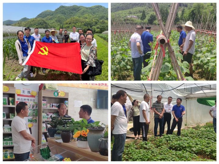 在金成家庭农场,全体党员走进大棚、田间,对有徒长现象的设施大棚番茄进行整枝疏果,提出了中后期管理技术意见;对鲜食玉米种植区进行除蘖删苗,给出了喇叭口期病虫害防治和攻穗肥施用的意见;现场诊断水果黄瓜田间发生的病害,给予相应的防治技术意见;对露地种植的茄果类作物田块,给出了后作种植秋马铃薯的粮经作物搭配茬口建议;根据该农场为菜篮子保供基地的属性,赠送了速生叶菜品种‘双耐’、‘早熟5号’和耐热青梗菜‘杭绿3号’,建议尽快在闲置大棚、土地抢晴播种,针对性提出夏秋季速生叶菜生产注意事项,积极发挥保供基地缓解杭州市场叶菜夏淡的作用。
