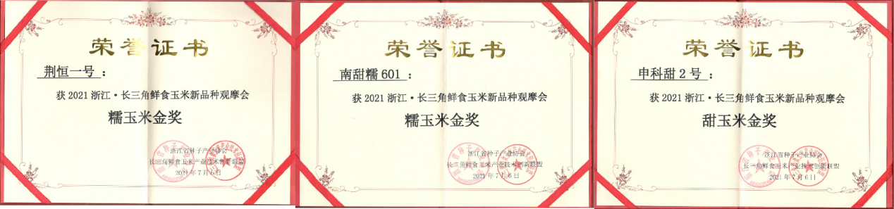 7月6日,在东阳市召开的2021浙江鲜食玉米新品种观摩交流会上传来嘉讯:由杭州种业集团开发的‘南甜糯601’、‘申科甜2号’和‘荆恒一号’3个玉米新优品种获得省级“十大”金奖品种。