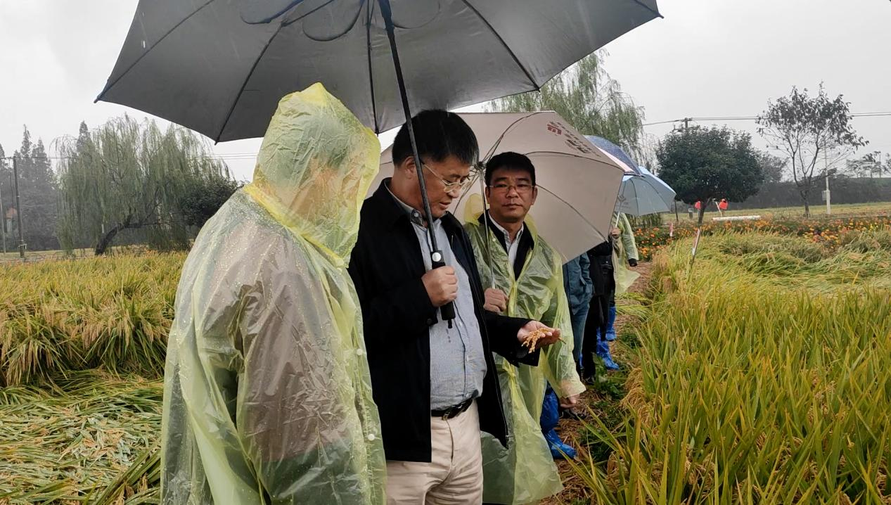 胡培松院士冒雨实地考察了我集团径山育种科研基地籼粳杂交稻新品种(组合)试验展示现场,走进田间逐株查看了‘浙杭优220’、‘品40’、‘示8’、‘示13’等表现突出品种(组合)的分蘖特性、株叶形态以及穗粒结构,高度肯定了集团自主选育水稻不育系‘浙杭K2A’的广亲和性与特异的后期转色,高度评价了籼粳交品种‘浙杭优220’在长江下游水稻新品种大会展示现场和径山基地共同表现出来的高产稳产、剑叶短挺、蘖强穗多、灌浆一致、青杆黄熟等优异特性。