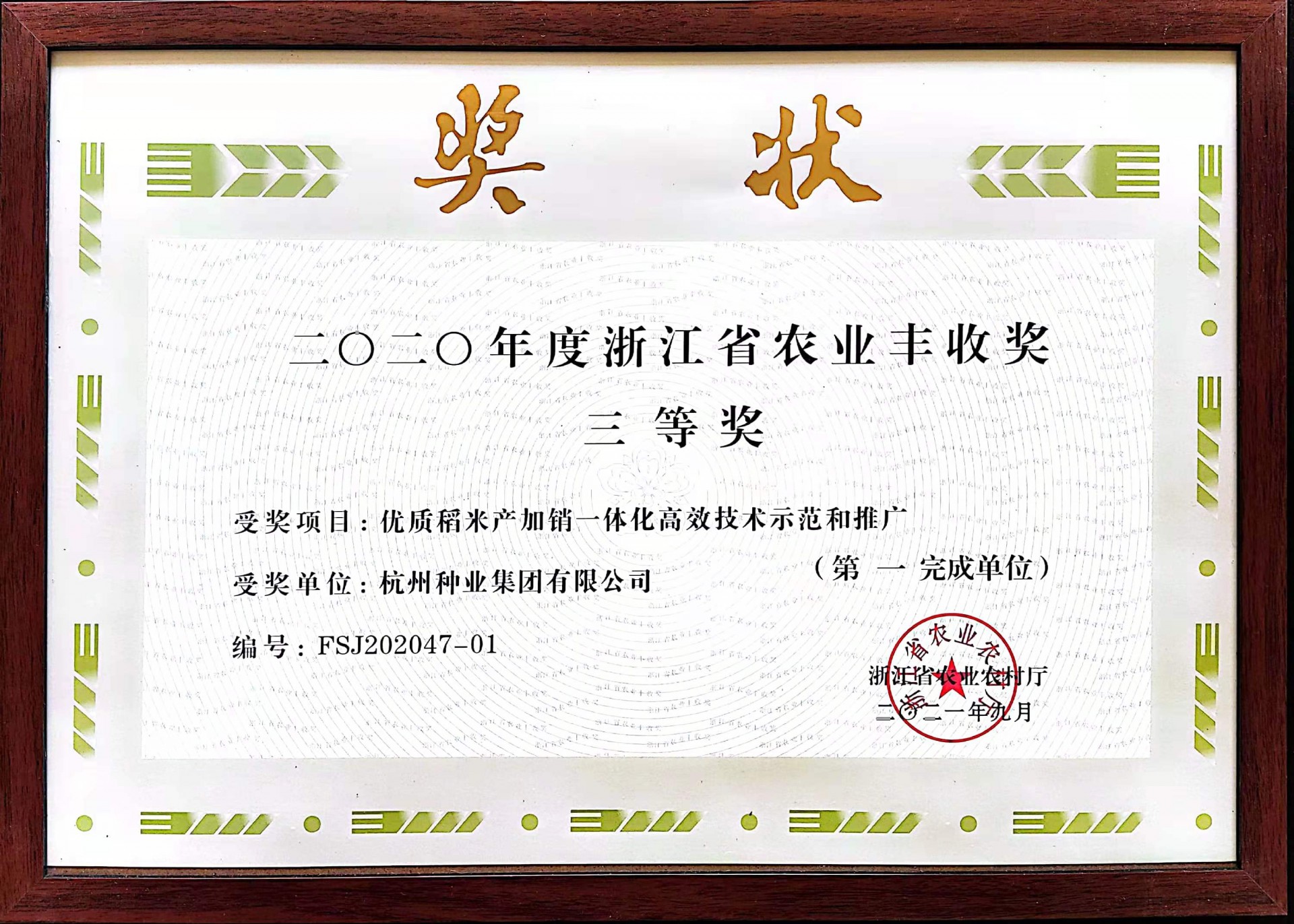 日前,杭州种业集团主持完成的《优质稻米产加销一体化高效技术示范和推广》获得浙江省2020年度农业丰收三等奖。该项目针对水稻生产稻米品质不优、效益不高、产业链不长等关键问题,开展优质稻米产加销一体化示范推广,研究建立了适时精量播种、叠盘出苗育秧、减氮增钾提质、绿色防控增效等为核心的优质稻保优栽培技术和优质稻米生产技术进一步带动了水稻绿色高质高效发展。
