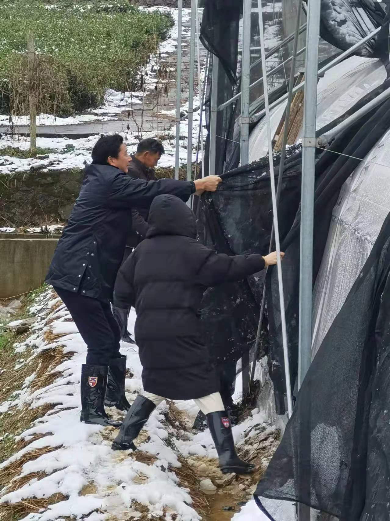 组织有号召,立马见行动。背上铁锹、拿上扫把、扛上稻耙、拎起竹棒,平时的农用工具,摇身一变都成了清雪的“金箍棒”。果树种质资源保存区枇杷树上的积雪被抖落了,蔬菜原种保障留种棚、叶菜纯度鉴定棚一个接一个被清扫完毕了。雪水和泥水把道路变得更加泥泞,这群农人没有停下前行的脚步,他们中有党员、有群众、有退休职工,即使手再冷、脚再冻,面对疫情防控和雨雪的双重考验,他们不惧严寒、不畏风雪,依然奔走在风雪地头,坚守在平凡的岗位上。