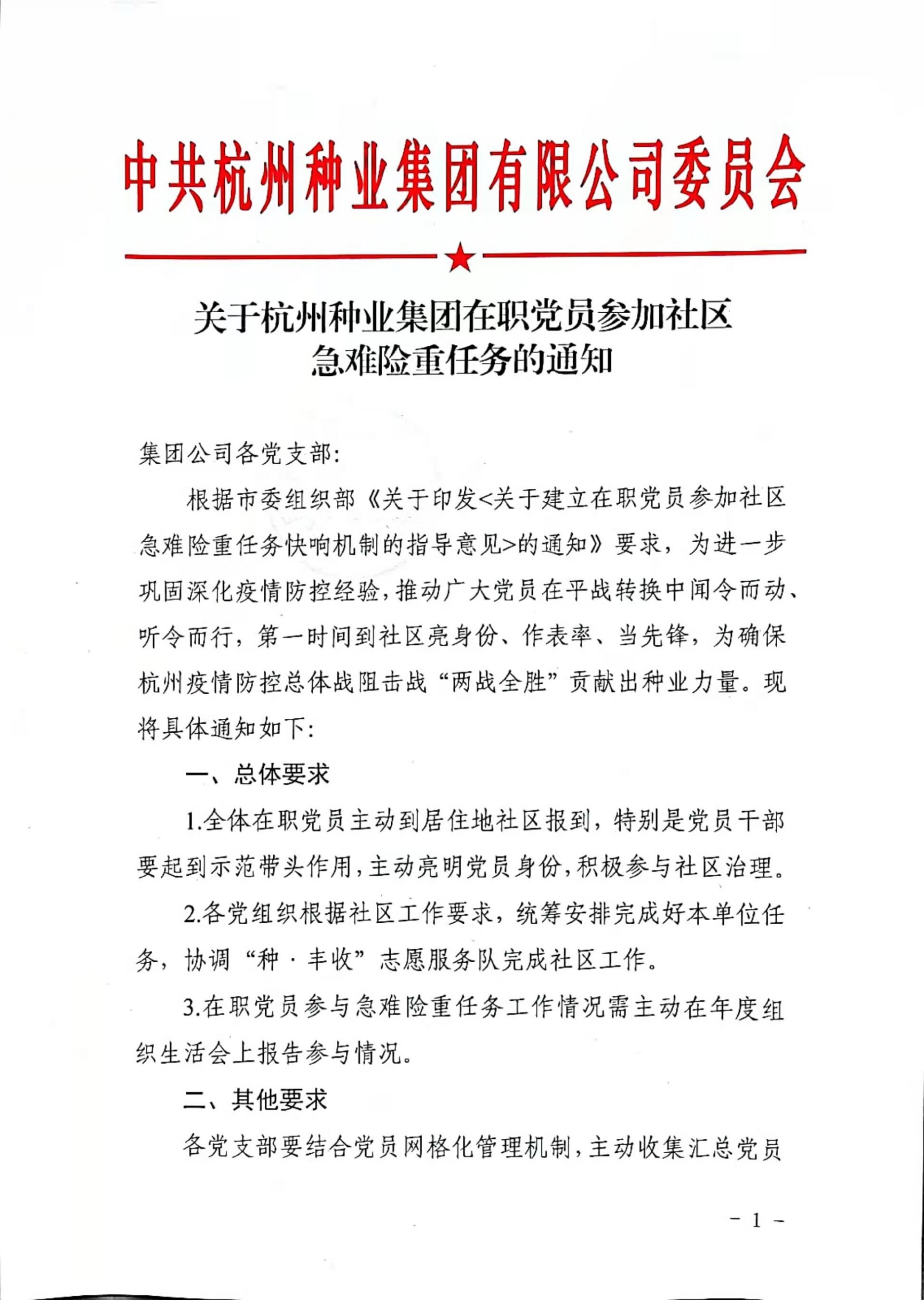 先锋领航,党组织有担当。集团党委认真制定《关于杭州种业集团在职党员参加社区急难险重任务的通知》,主动对接属地“金秋花苑”社区,号召党员到社区亮身份、作表率、当先锋,为确保杭州疫情防控总体战阻击战“两战全胜”贡献出种业力量。