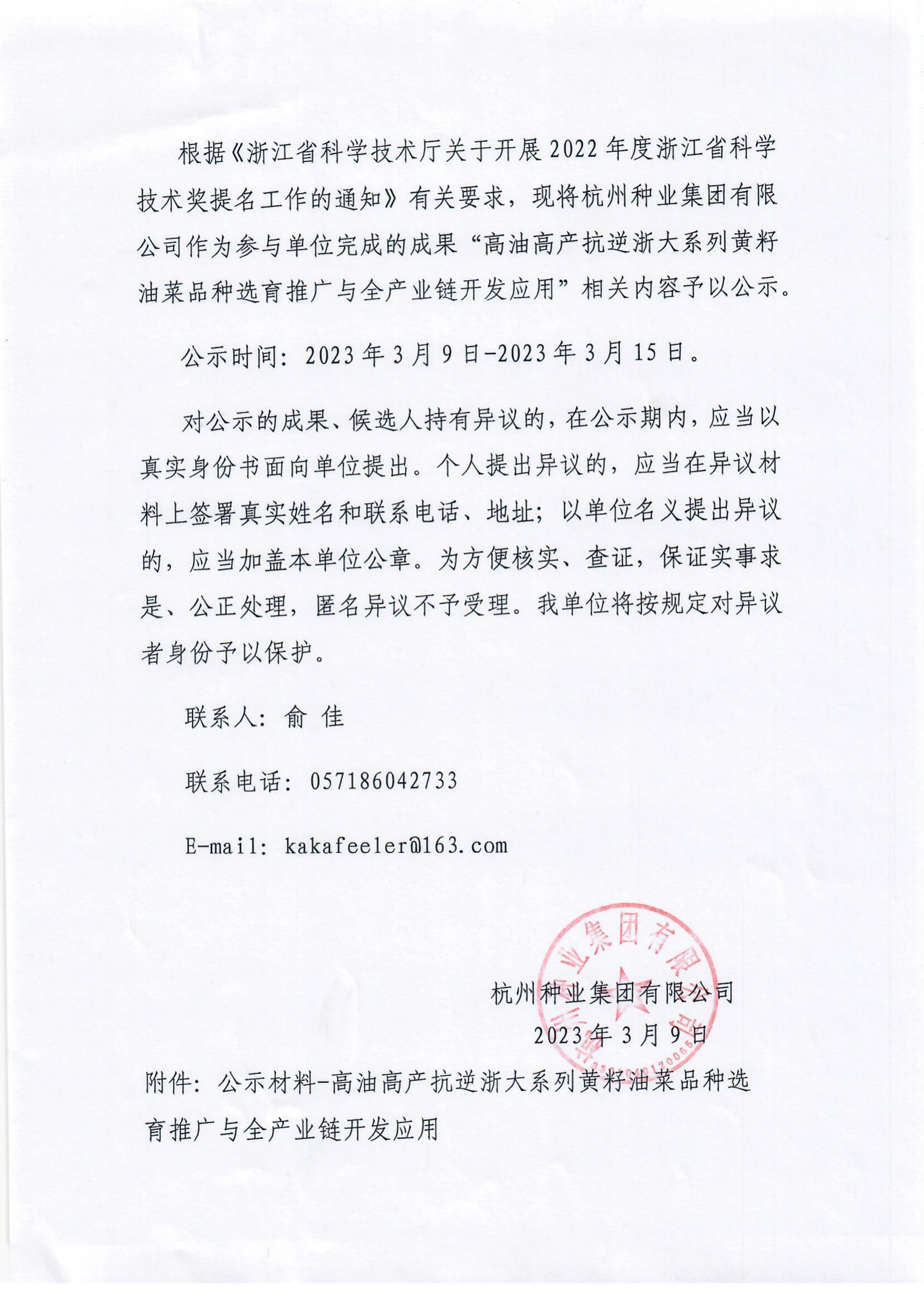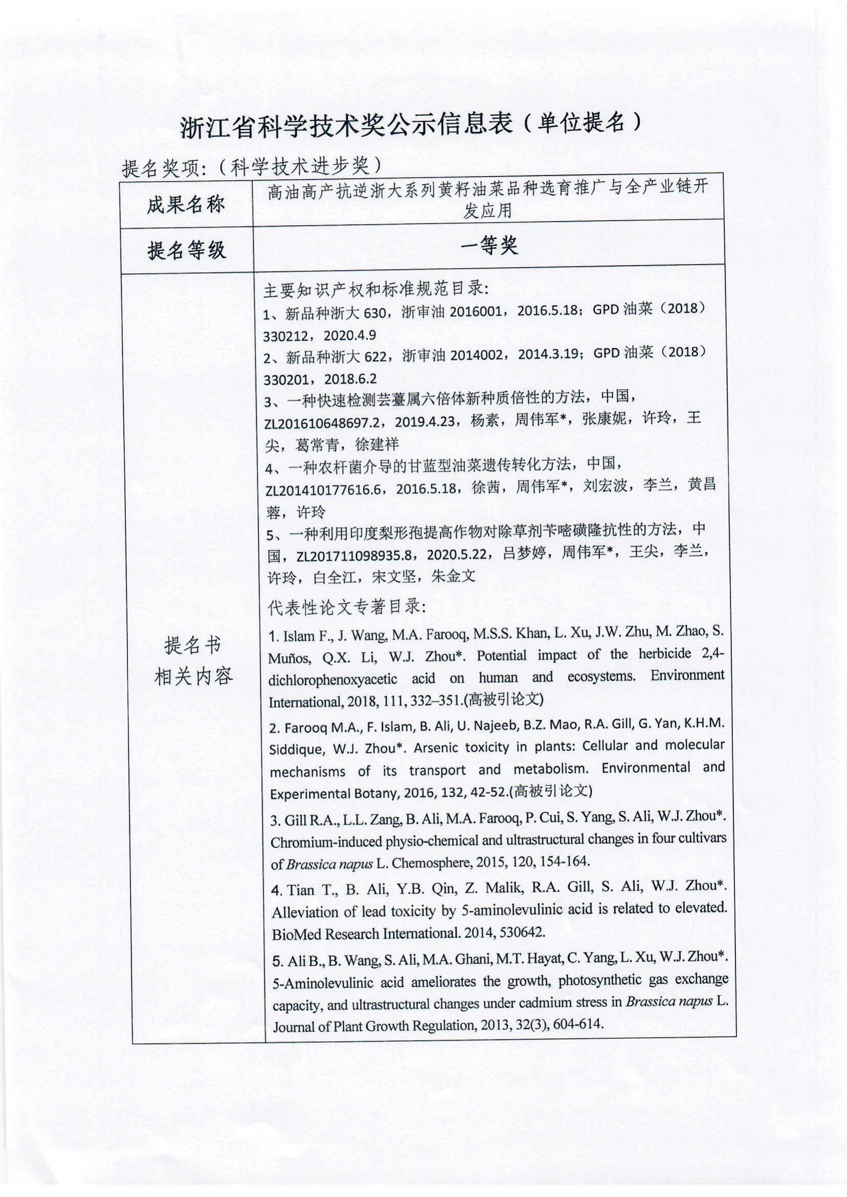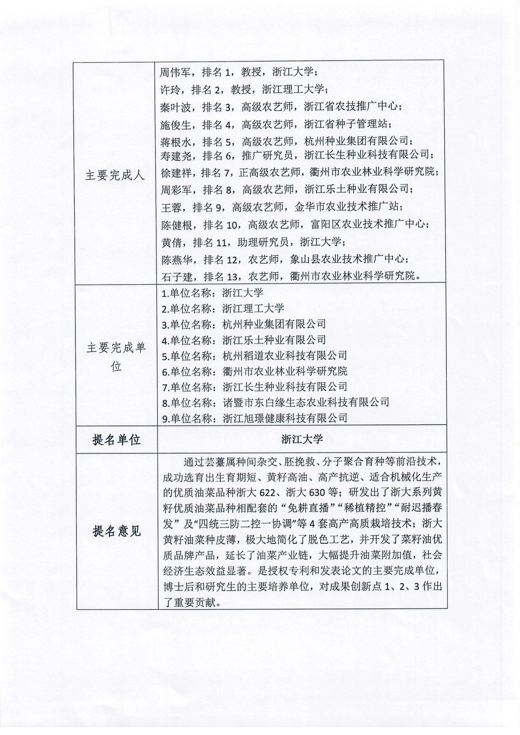 公示材料-高油高产抗逆浙大系列黄籽油菜品种选育推广与全产业链开发应用