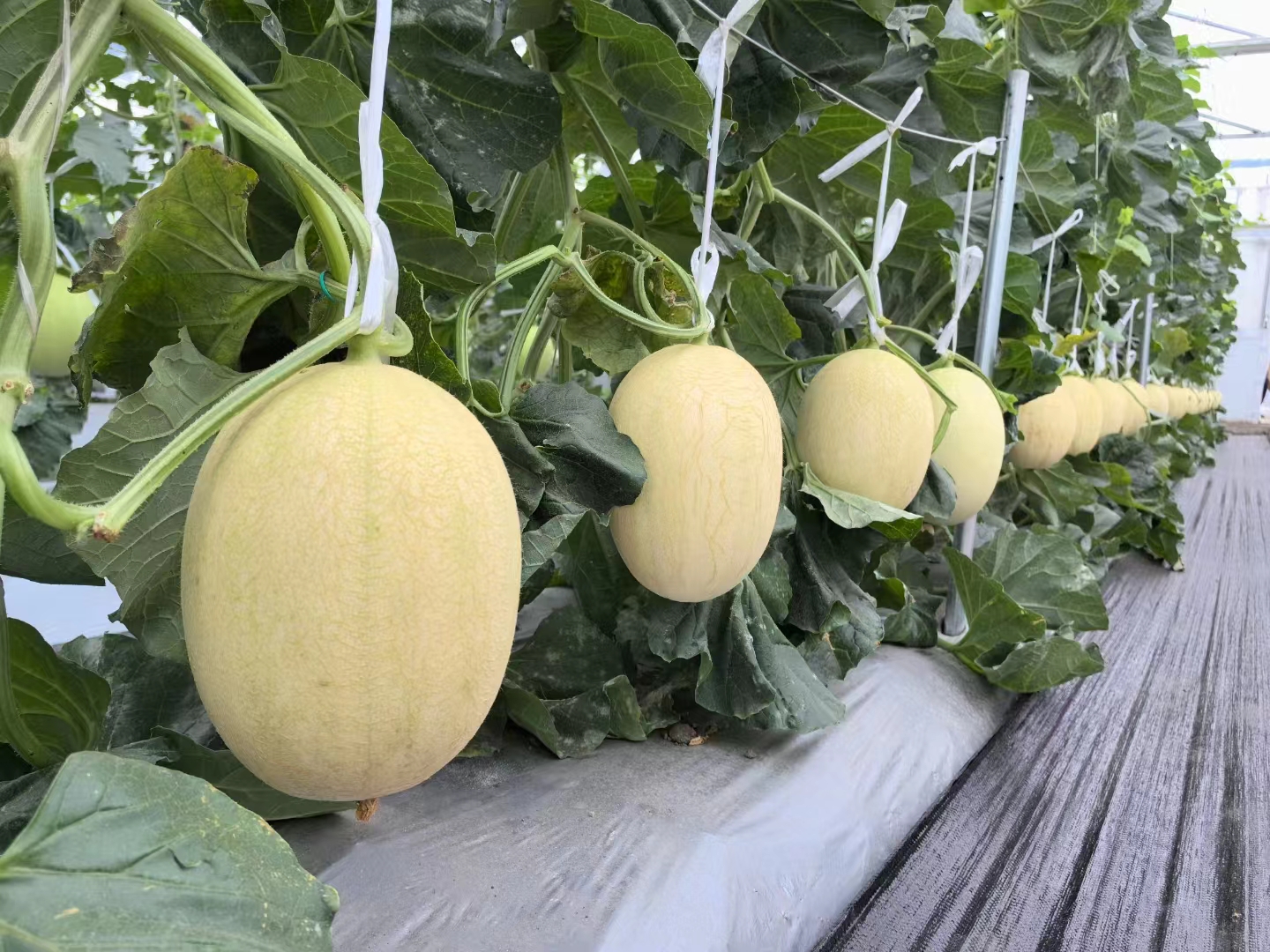 厚皮型杂交种。植株生长势强,株形中等。全生育期118天,果实发育期38天。雌花类型双性花,第一雌花节位10节;雌花出现的间隔节位1节;坐果习性子蔓孙蔓均可坐果,坐果易,果实类型网纹厚皮,形状椭圆,果皮底色白。果面部分网纹,网纹凸、细,稀果面裂纹。单果重量1.6千克;果肉颜色橙,果肉厚度3.9厘米;果实种腔中,果实香味淡,果实成熟后,果柄脱落难,商品果实率95%。中心可溶性固形物含量16.8%,边部可溶性固形物含量12.6%,肉质松脆、口感好,味鲜,甜而不腻。中抗白粉病、霜霉病。第1生长周期亩产2090.3千克,比对照西州蜜25号减产3.43%;第2生长周期亩产2199.7千克,比对照西州蜜25号减产1.02%。